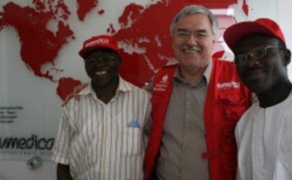 Bei einem Besuch in der humedica-Hauptzentrale bedankten sich die beiden Gäste herzlich für alle insbesondere vermittelnde Unterstützung. „Ich bin unendlich dankbar, dass ich als gesunder Mann zurück zu meiner Familie gehen kann“, erklärte ein glücklicher Antoine. Und Dr. Gbessi ergänzte: „Wir haben uns sehr willkommen gefühlt. Es ist ein Segen, dass Menschen wie Prof. Dr. Stiegler ihr großes Wissen an uns weitergeben, damit wir es in unserer Heimat einsetzen können.“