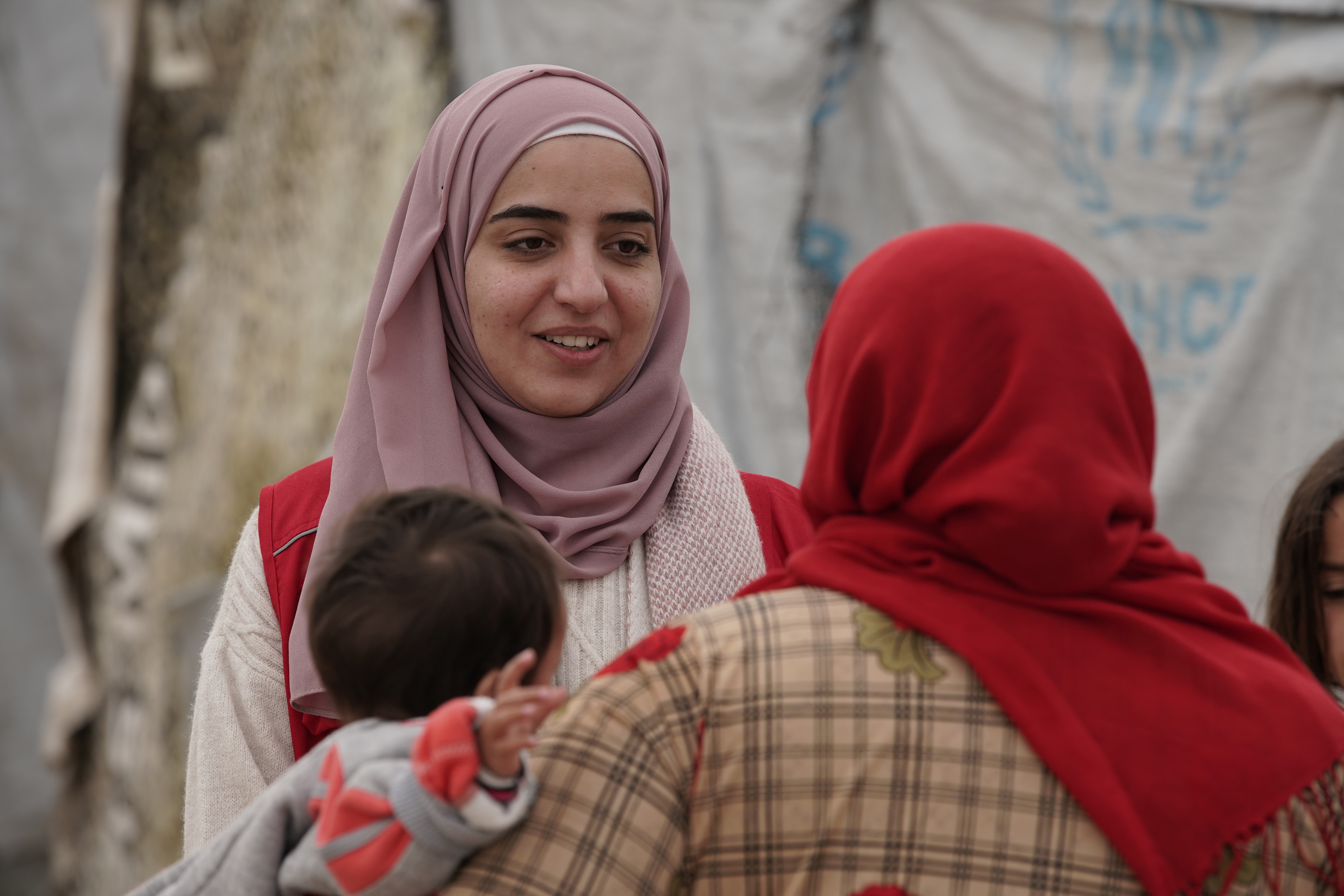 Samira im Gespräch mit einer Mutter und ihrem Baby im Flüchtlingscamp in der Bekaa-Ebene.