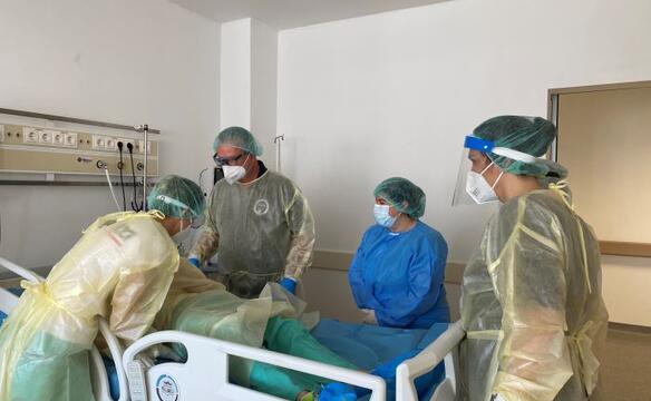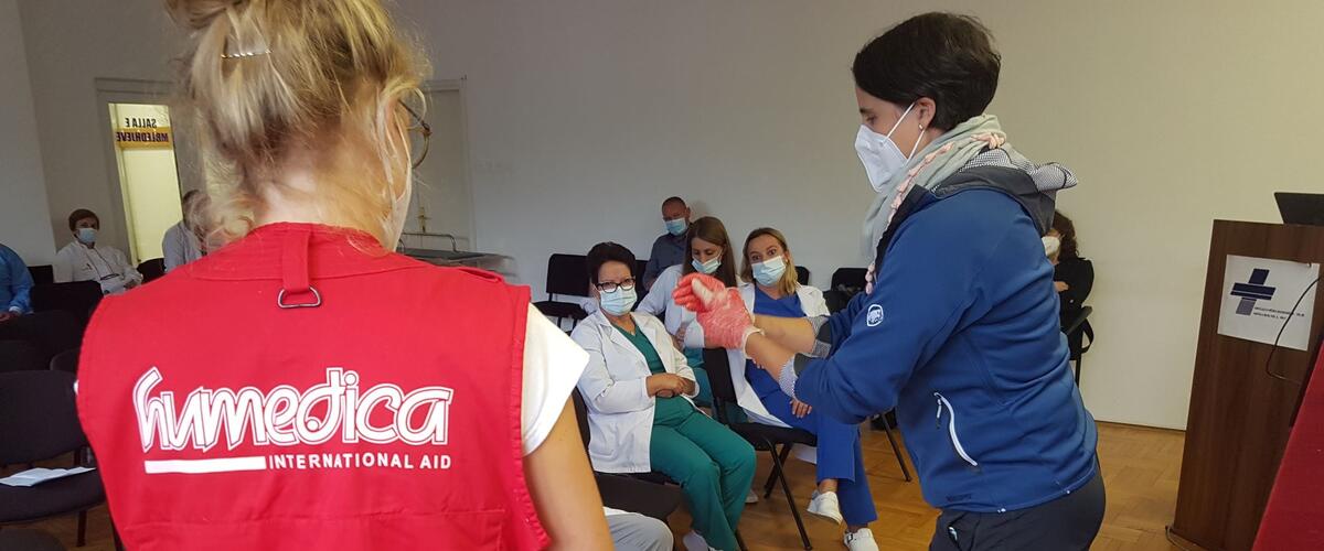 Die Aufgabe des medizinischen Teams, dem neben Einsatzkräften von humedica auch Experten der Johanniter Auslandshilfe, I.S.A.R. Germany, des Robert Koch-Instituts, des Universitätsklinikums Hamburg Eppendorf, der Universitätsklinik Charité Berlin und der Bundeswehr angehören, ist es, die kosovarischen Ärztinnen und Ärzte sowie das Pflegepersonal zu schulen. „Wir begleiten unsere Kolleginnen und Kollegen in den Krankenhäusern, wenn sie Patienten behandeln und beraten sie in Therapie und Diagnostik. Außerdem führen wir spezielle Schulungen und praktische Übungen durch, beispielsweise Atemtherapie, Lagerungstraining oder im Bereich Kontrolle der Infektionsausbreitung“, berichtet Katharina. „Teilweise drehen wir Lehr-Videos, verteilen Flyer und Plakate, damit die Inhalte mehr Menschen zur Verfügung stehen.“