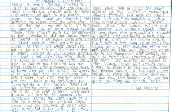 Die beiden Kinder sind nun alt genug um Geschehenes zu begreifen. Sie realisieren wie sehr humedica und die Menschen dahinter ihr Schicksal beeinflusst haben. Durch selbst geschriebene Briefe möchten die beiden Buben ihre Dankbarkeit ausdrücken. „Ich möchte mich bei Ihnen für Ihre finanzielle Unterstützung über die Jahre bedanken. Meine Mutter hätte es alleine nicht geschafft“, schreibt Leo und führt fort: „Ich bin wirklich dankbar, dass es mir möglich war, eine gute Schule zu besuchen.“