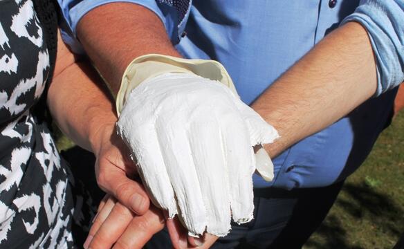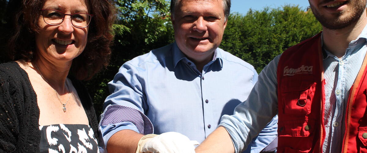 Bei der diesjährigen 24 Stunden Tour des Oberbürgermeisters von Kaufbeuren, Stefan Bosse war humedica die siebte Station. Das bot eine gute Gelegenheit den neuen humedica Vorstand, Heinke Rauscher und Johannes Peter, persönlich im Gespräch kennenzulernen. „Wir arbeiten auch weiterhin gut miteinander und bringen den Namen der Stadt Kaufbeuren mit den humedica Einsätzen, für Menschen in Not, zusammen in die Welt“, bekräftigte der OB im Gespräch. Gleichzeitig erhielt er einen Einblick in Teile der traditionellen humedica Arbeit. Während des Gesprächs legte die ehrenamtliche humedica Helferin Susanne Engelhart seine Hand in Gips. Eingipsen gehöre zu den Trainingseinheiten der zur Vorbereitung für die Einsätze erklärte humedica Vorstand Johannes Peter. Gipshände formen sei aber auch ein Teil der Informationsarbeit, ergänzte Heinke Rauscher, ebenfalls humedica Vorstand und zuständig für die Kommunikation der Organisation. Zusammen mit den Handabdrücken der neuen Geschäftsführer von humedica soll am Ende eine Skulptur entstehen, die die Verbundenheit mit der Stadt Kaufbeuren symbolisiert.