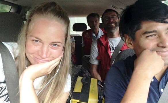 Am Münchner Flughafen nimmt uns die nette Sophie in Empfang. Sie ist diejenige, die immer mit anonymer Nummer anruft und sich als Projektbetreuerin von humedica in den nächsten zehn Tagen um unser Team kümmern wird. Jetzt muss ich meinen Kopf wieder auf Notfall umstellen. Mein Handy immer auf laut haben und es ja auch hören. Ich erinnere mich noch sehr an die Notfallübungen im Training. Wenn man in solchen Situationen sein Handy nicht hört, ist es fatal. Aber darüber zerbreche ich mir im Flieger den Kopf. Jetzt heißt es erstmal, die rote humedica-Weste anziehen und die Rolle als Koordinatorin annehmen.