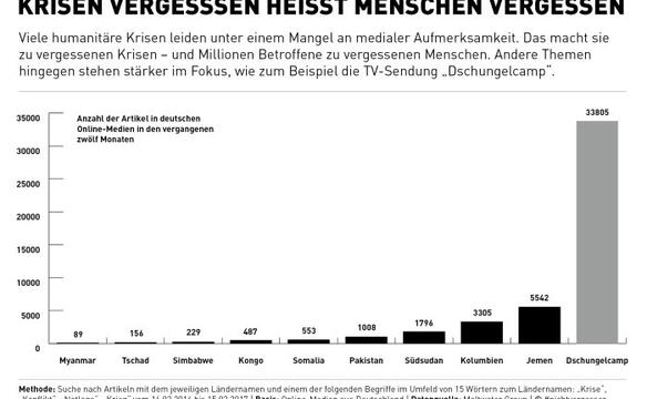 Wie selten tatsächlich über diese Krisen und ihre Opfer berichtet wird, zeigt ein Vergleich mit vermeintlich weniger relevanten Themen. Während etwa das Realityformat Das Dschungelcamp in den vergangenen zwölf Monaten stolze 33.805 Mal in deutschen Online-Medien Erwähnung fand, schaffte es die humanitäre Krise in Pakistan nur rund eintausend Mal in die Berichterstattung im Netz, Myanmar gerade einmal 89 Mal.