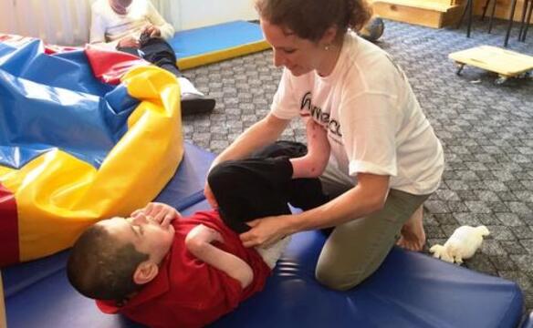 Die Arbeit unseres Teams setzte an genau diesem Punkt an. Wir schulten die freiwilligen Helfer in der professionellen Pflege der Jungen und zeigten Wege auf, wie sie Brücken zu den Kindern schlagen und die Bedürfnisse der Behinderten besser erkennen können. Die Jungen genossen die Aufmerksamkeit und die behutsamen Pflegemaßnahmen sichtlich. Wie etwa der neunjährige Danja, der wegen seiner Unruhe und seinem vielen Schreien sonst von den Betreuerinnen an den Rollstuhl gefesselt wird, und der sich nun offensichtlich über die langen Spaziergänge und die Balgereien mit uns freute.