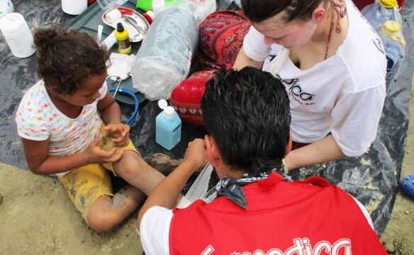 Die Verletzungen, die uns begegnen, sind Schnitt- und Schürfwunden, die oft infiziert sind. Die Hygienesituation ist schlecht, denn es gibt vielerorts immer noch zu wenig Wasser. Außerdem begegnen uns zunehmend Bronchitis, Durchfall, Magen-Darm-Infekten mit Fieber und posttraumatische Belastungsstörungen.