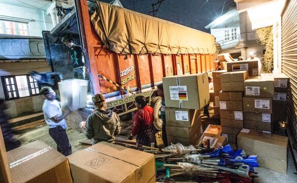 Am vergangen Freitag kam das zweite Einsatzteam von humedica mit fünf Tonnen Hilfsgütern im Gepäck in Kathmandu an. Nachdem wir die Paletten aus dem Zoll hatten, wurde die Fracht dank der Hilfe vieler Einheimischer im Lagerraum unserer Unterkunft verstaut. Den Abend nutzten wir für die erste gemeinsame Teambesprechung und Planungen für den kommenden Tag.