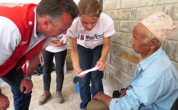 Weil die dortige Klinik durch das Beben so stark beschädigt wurde, haben unsere Mediziner eine Art Zeltklinik aufgebaut und damit einen vergleichsweise sicheren Raum für die Verletzten geschaffen. Einer der ersten Patienten von heute ist ein alter Mann. Er erzählt uns, dass er während des Erdbebens verschüttet wurde. Eine unendlich lange Stunde lag er unter den Trümmern begraben, doch zum Glück wurde er rechtzeitig gefunden und konnte gerettet werden. Jetzt klagt er über Schmerzen beim Atmen und schweren Husten. Um seine Heilung so angenehm wie möglich zu machen, verschreibt ihm unsere Ärztin Schmerzmittel.