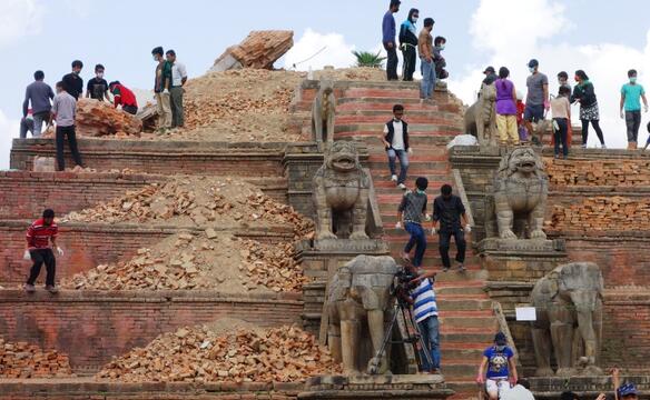 Dort ist die Zerstörung unglaublich, Tempel und angrenzende Gebäude sind in sich zusammengefallen. Auf einer Hälfte des Platzes sind Notunterkünfte und Zelte für die medizinische Versorgung aufgestellt, auf der anderen Seite ist alles abgesperrt, da für die vom Erdbeben beschädigten Gebäude eine akute Einsturzgefahr besteht. Doch das Leben muss weiter gehen und so beobachte ich vom Militär geleitete Aufräumarbeiten und Anwohner, die in den angrenzenden Gassen mit dem Wiederaufbau ihrer Unterkünfte beginnen.