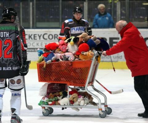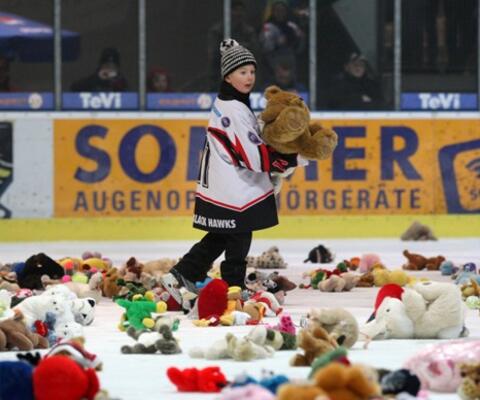 Für ihr letztes Spiel der Hauptrunde hatte die Eishockeymannschaft aus Niederbayern zu einem „Teddy Bear Toss“ aufgerufen, also zum Werfen von Teddybären. Der den 700 Fans kommunizierte Zeitpunkt für die Aktion war dabei ein ganz spezieller: nach dem ersten Tor der eigenen Mannschaft sollten die Kuscheltiere fliegen.