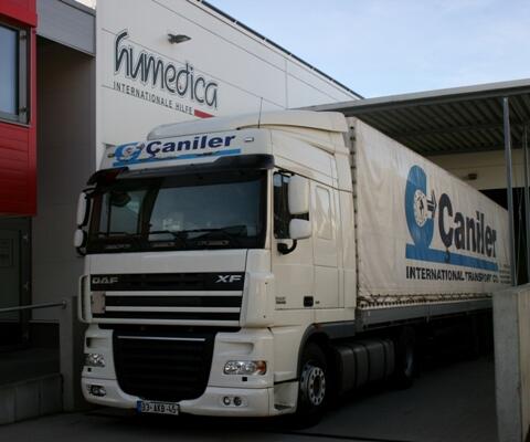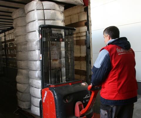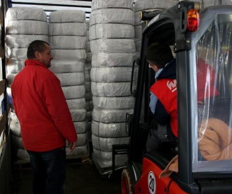Am 31. Januar wurde die Fracht von 9.000 Wolldecken, 41 Rollstühlen, zwei Rollatoren und 70 paar winterfesten Kinderschuhen beim Lager von humedica in der Goldstraße auf einen LKW verladen. Die Prozedur dauerte einen knappen Vormittag, bis er fertig beladen war und losstarten konnte.