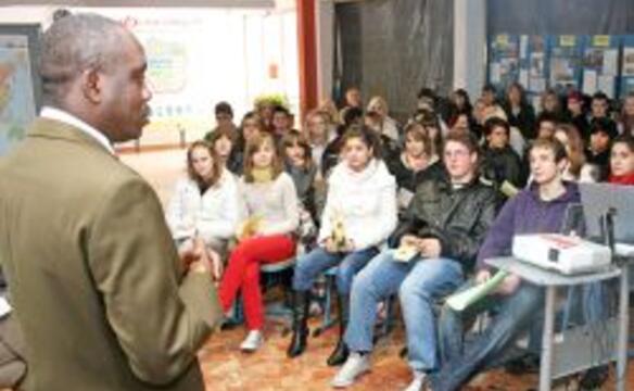 Den zweiten Tag seines Allgäuaufenthalts startete Botschafter Bio mit einem Unterrichtsbesuch an der Gustav Leutelt-Schule in Neugablonz. Vor etwa 100 Schülern der neunten Klassen erzählte der Diplomat von seiner Heimat und seinem Beruf. Interessiert hörten die Schüler und Schülerinnen zu und stellten im Anschluss viele Fragen.
