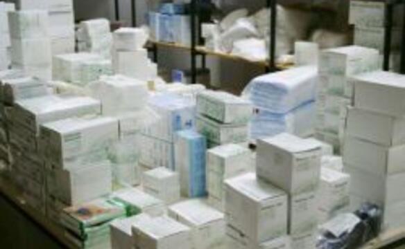 Daneben, in einem größeren Lagerraum, liegen Verbandmaterial und chirurgische Instrumente neben Rollstühlen, Krankenbetten und Hygieneartikeln.