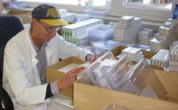 Eine große Palette von verschiedenen Medikamenten liegt in dem großen Raum, daneben liegen viele kleine Kisten; auf jeder steht eine Zahl. Die 12 Mitarbeiter sortieren, nummerieren und ordnen ein.