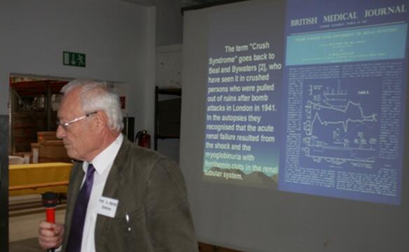 Dem intensiven Austausch der Teilnehmer, die sich mitunter von verschiedenen humedica-Einsätzen bereits kannten, folgte ein durchaus spannender Fachvortrag durch Professor Dr. Bernd Domres. Der erfahrene Chirurg und weltweit anerkannte Referent, der unter anderem an der renommierten Universität zu Tübingen lehrte, stellte verschiedene Möglichkeiten der effizienten medizinischen Hilfe bei Erdbebenkatastrophen vor.Professor Dr. Domres, der verschiedene Katastropheneinsätze für unterschiedliche Organisationen vorweisen kann, war noch im August mit einem humedica-Einsatzteam in Pisco (Peru), um nach dem starken Erdbeben Hilfe zu leisten. Seine detaillierten Ausführungen zu den in Katastrophen häufig erlebten "Compartment" oder "Crush Syndrom" bewiesen einmal mehr seinen internationalen Ruf als Kapazität auf diesem Gebiet.