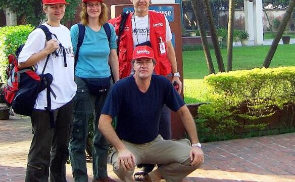 Dann geht es endlich los. Alle sind gespannt, was vor uns liegt. Kein Einsatz ist wie der andere. Stets sind es neue Menschen, andere Rahmenbedingungen und Umgebungsparameter. Als wir dann am nächsten Tag in Dhaka ankommen, erwarten uns bereits Mitglieder unserer lokalen Partnerorganisation Koinonia. Und die müssen erst einmal Geduld haben, bis wir aus dem Flughafen herauskommen; weigern sich doch die Einreisebehörden anfänglich hartnäckig uns ein 30 Tage-Visum auszustellen - normal sind 14 Tage. Schade, dass Bürokratie katastrophenresistent ist... . Nach zähen Verhandlungen, Rücksprache bei vorgesetzten Dienststellen und einem schnell noch formlos aufgesetzten schriftlichen Antrag erhalten wir es dann doch: unser Team darf sich für 30 Tage im Land aufhalten und Hilfe leisten. Mitten in der Nacht erreichen wir dann ein Gästehaus, dessen Betten uns eine erholsame Nachtruhe bescheren. Im Flugzeug konnte nämlich keiner von uns so recht schlafen… .