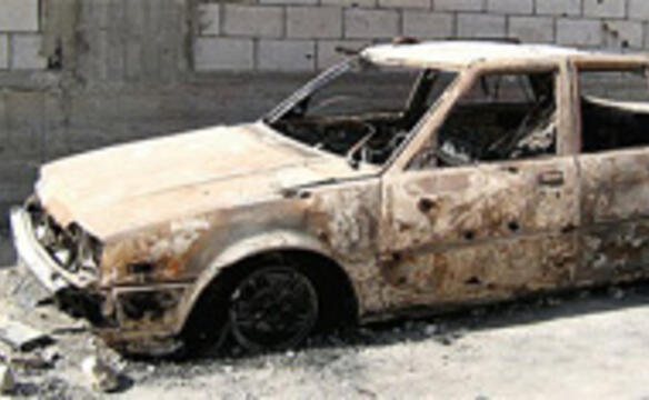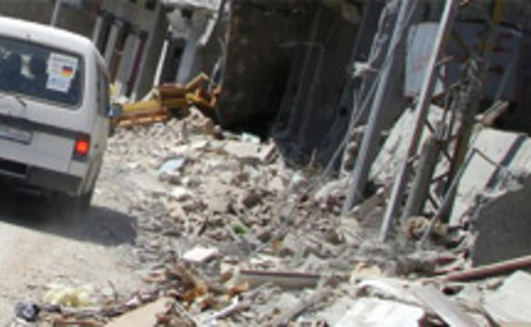 Dazu Hitze und Staub. Verkarstete Berghänge, manchmal mit dunklen Flächen, Spuren der Phosphorbomben. Die Häuser: abgedeckt, schräg umgeworfen, zersiebt, plattgedrückt, schwarz verbrannt. Zerfetzte Autos und Laster am Straßenrand. Viele Autos besitzen nur noch eine Eigenschaft: sie bewegen sich vorwärts. Irgendwie. Türen fehlen teileweise, der Lack ist zu dreiviertel weg, die Fenster völlig. Und alles, was mit der Beleuchtung zu tun hat, ist sowieso nicht vorhanden. Die Polizei hat sicher andere Probleme.