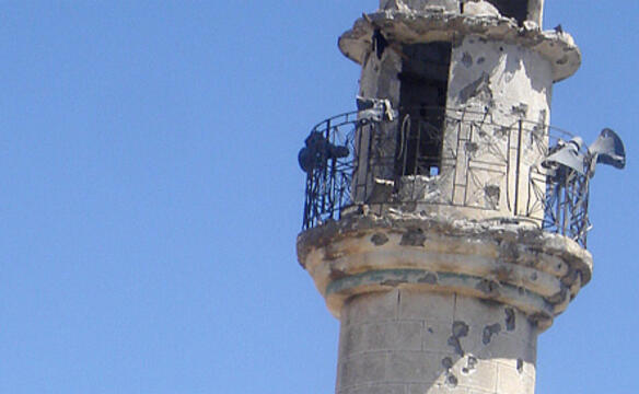 Wir halten in der Mitte eines Dorfes, manche Häuser sind sehr ansehnlich. Neben der nur wenig zerstörten Moschee befindet sich ein halb in Trümmern liegendes Mausoleum. Hier finden wir einen Raum, notdürftig von Schutt befreit, es fehlt an allem, was zur Hygiene nötig wäre: Wasser, saubere Tücher... Was ich an humedica schätzen lerne ist, daß wir alles Nötige dabei haben und nicht auf andere angewiesen sind. Wir spannen einen Vorhang quer durch den Raum, hängen die Fahne von humedica auf, suchen Tische und Stühle zusammen. Wir werden vom Ortsvorsteher begrüßt, auf der Treppe stehen schon die ersten, dunkel gekleideten Frauen, Kinder und Männer.