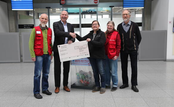 Claus-Dieter Wehr, Geschäftsführer des Bodensee-Airports Friedrichshafen übergibt Spendenscheck an humedica-Mitarbeiterin Roswitha Bahner-Gutsche und die ehrenamtlichen Helferinnen und Helfer