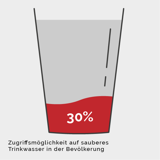 Zusätzlich haben ca. 70% der Menschen keinen Zugang zu sauberem Trinkwasser (Stand 2022). Die Folge: Nierenschäden und Durchfallerkrankungen nehmen zu. Um sauberes Trinkwasser für ihre Familien zu beschaffen, müssen viele Menschen Kilometer weit gehen.