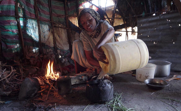 Dalia kocht Wasser in ihrer Hütte.